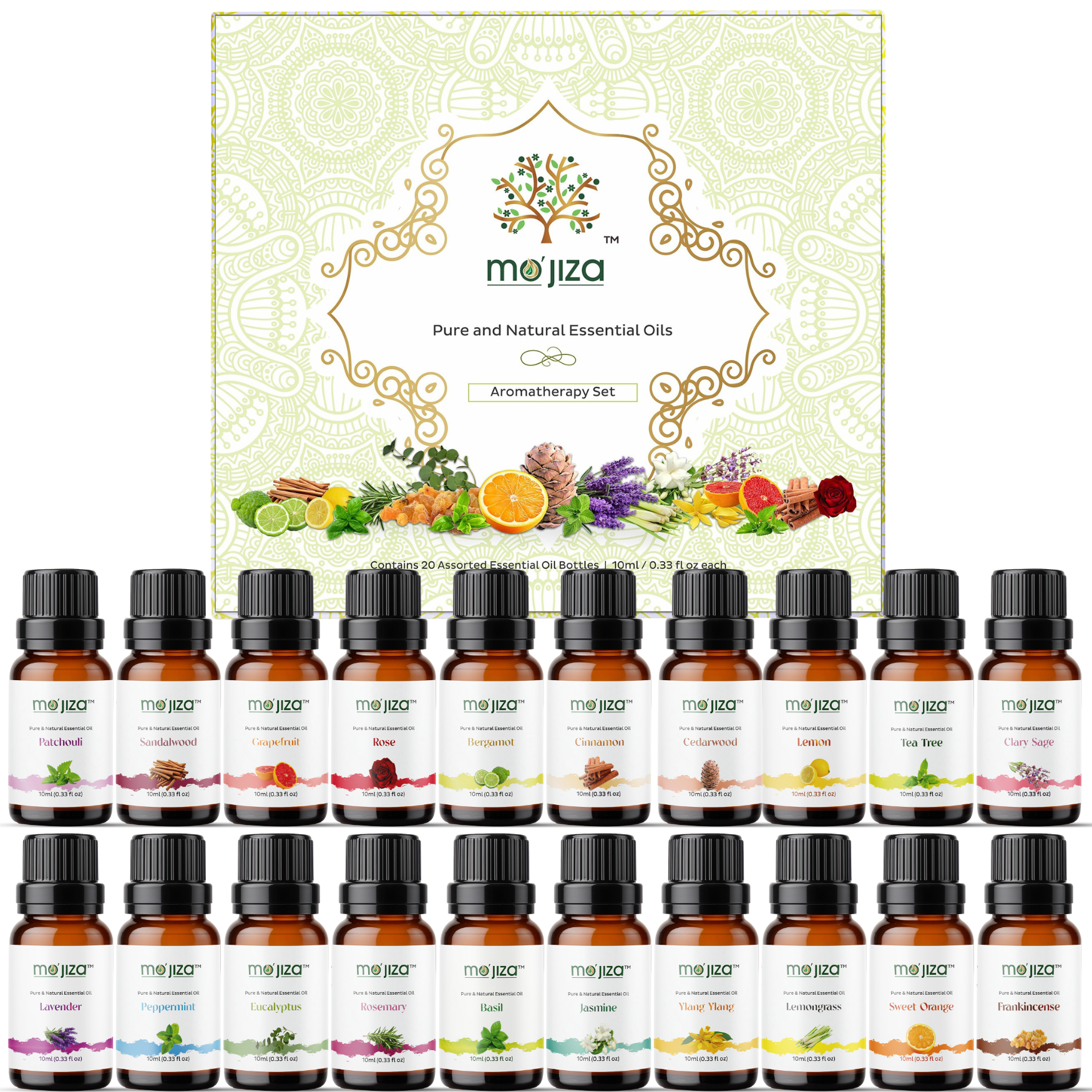 - A Gift of Nature's Magic: Beautifully designed and thoughtfully packaged in a luxurious giftset, MO'JIZA essential oils offer gift of tranquility and rejuvenation to your loved ones for birthdays, holidays, or self-care moments. Included 20 Oils: lemongrass, sweet orange, frankincense, lavender, peppermint, rosemary, eucalyptus, tea tree, lemon, cedarwood, basil, jasmine, ylang ylang, cinnamon, bergamot, sandalwood (santal), patchauli, rose, grapefruit, and clary sage, 10ml each.